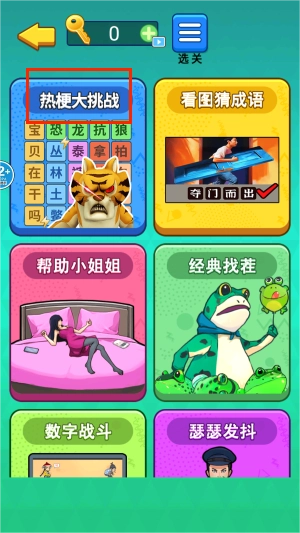 2、在模式选择界面找到"热梗大挑战"选项,点击后系统会加载最新最火的网络热词库。