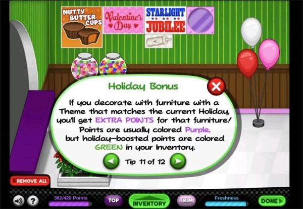 Tip11:如果你用与当前节日主题相匹配的家具装饰,你将获得额外的家具积分!点数通常是紫色的,但节日提升的点数在你的库存中是绿色的。