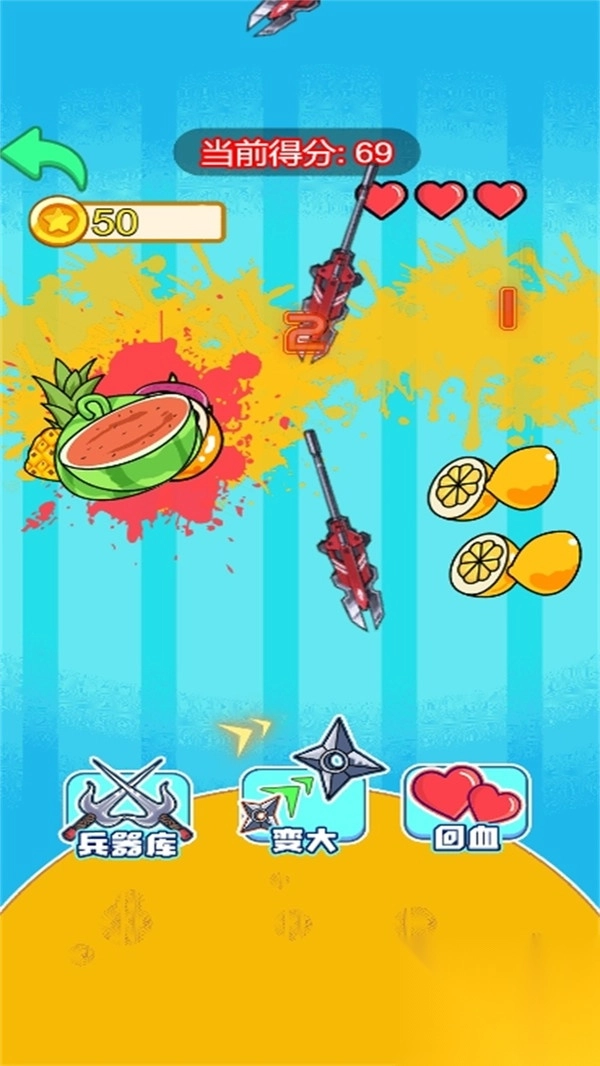 3.随着关卡的推进,游戏的难度会不断增加,水果的抛起速度会加快。