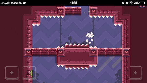 在后续关卡里,玩家们会碰到诸多障碍物。有时猫咪下落速度过快,根本来不及避开这些障碍物。就像上图中的猫咪,它脚下踩着软绵绵的砖块,没几秒砖块就会自行消失,猫咪便会随之掉落,踩到尖锐的刺而一命呜呼。
