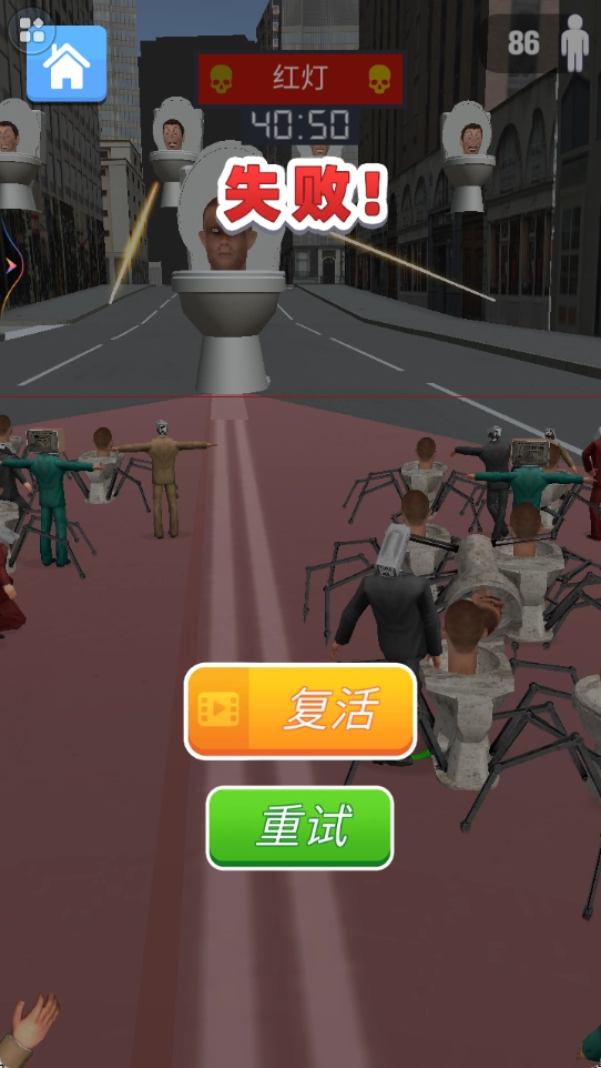 2、选红绿灯相关模式,需紧盯信号灯,绿灯时快速移动,红灯时保持静止,避免被马桶人击杀,在限时内冲过终点。