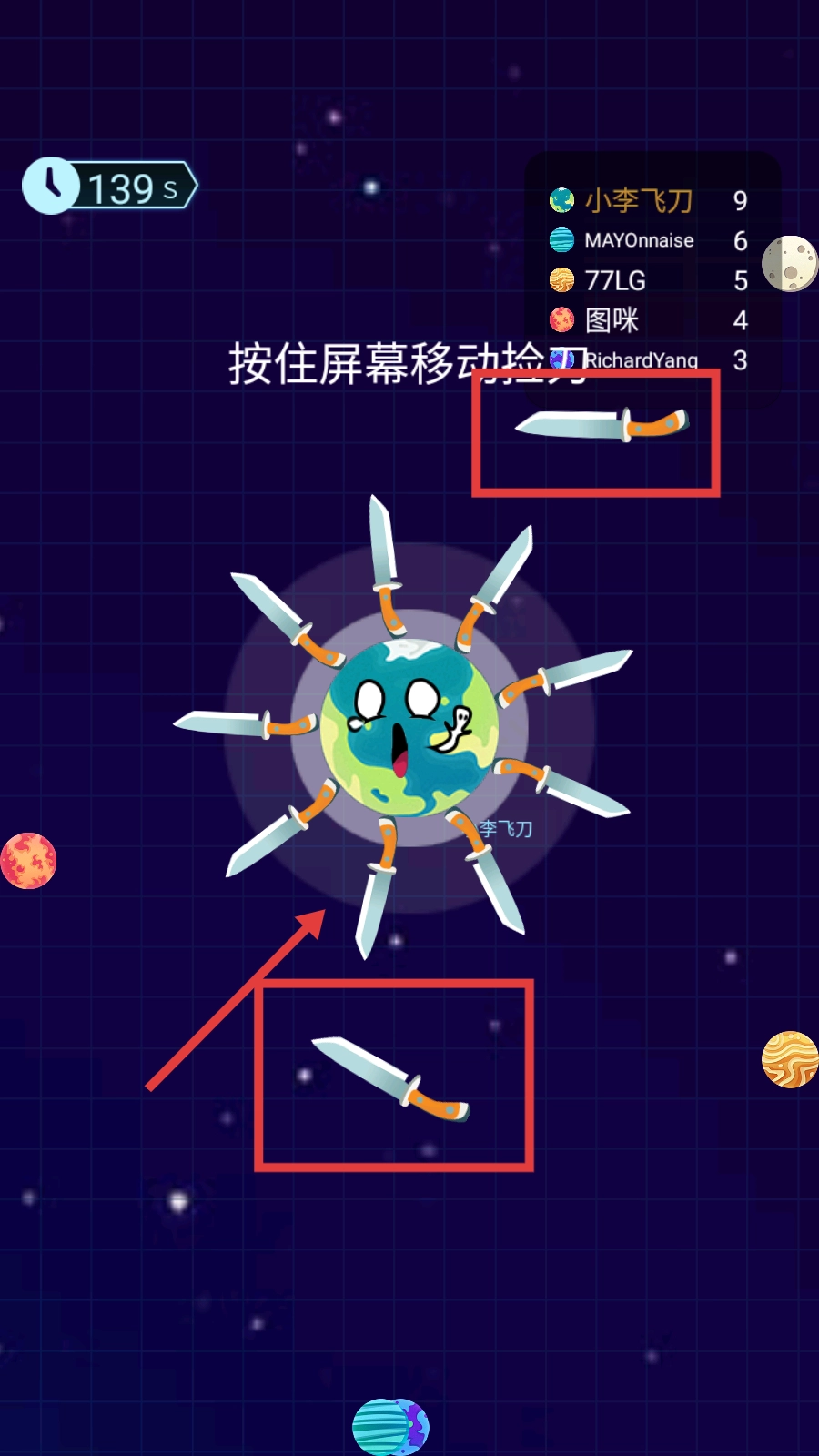 1、游戏中需【按住屏幕】移动角色,快速捡拾【飞刀】,积累数量为后续对抗做准备。