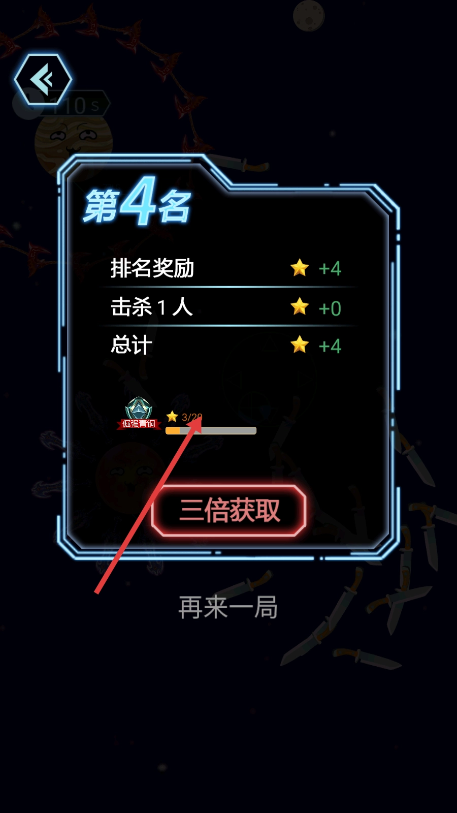 3、对局结束后,若想快速提升段位,可点击【三倍获取】,借助排名奖励加速积累【星星】进度。
