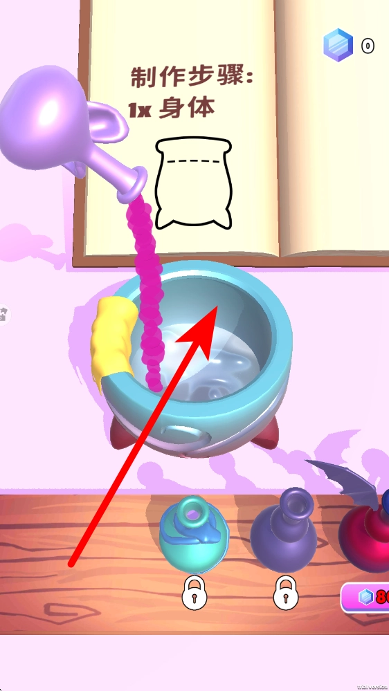 1、查看配方制作前先看魔法书里的配方要求,如示例需1乘以身体,挑选对应元素试剂,点击试剂将其倒入魔法锅,确保材料符合制作条件。
