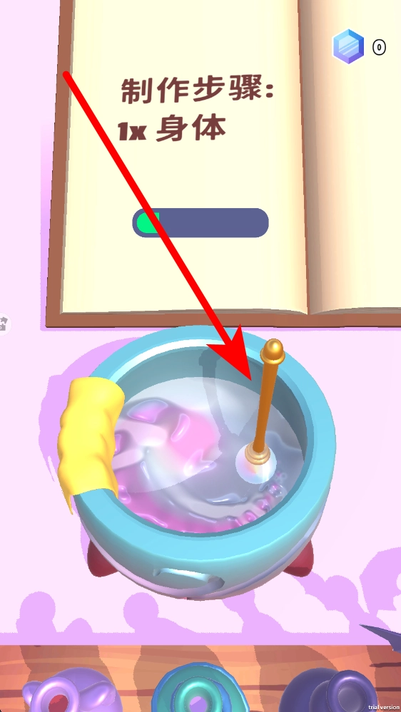 2、搅拌融合材料倒入后,用魔法棒搅拌锅内液体,让元素充分混合,观察液体变化,待达成配方反应状态,完成魔法注入关键步骤。