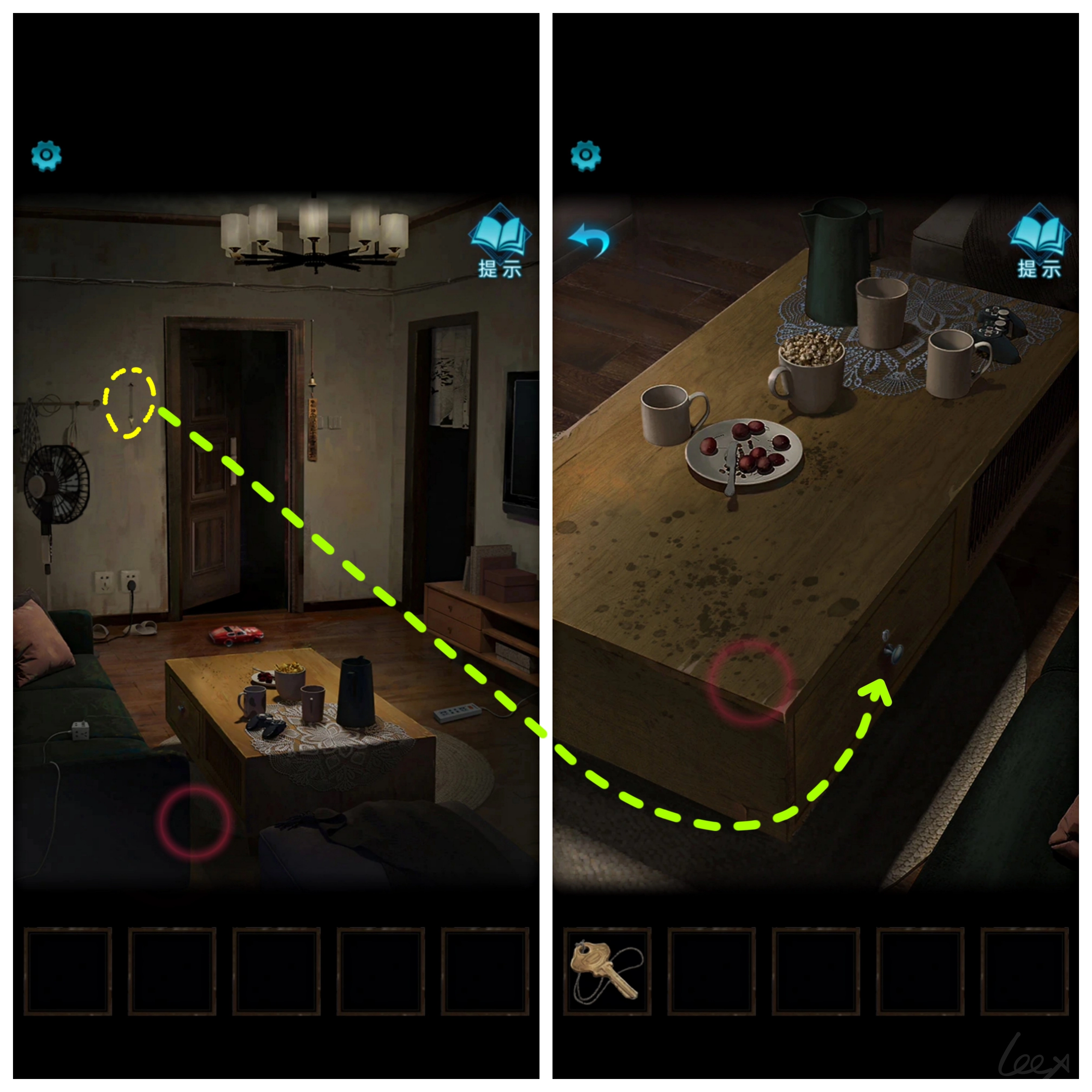 风扇把挂历吹掉,门左侧墙上拿到〔钥匙〕,用钥匙打开茶几抽屉,拿到〔玉簪〕,出门。
