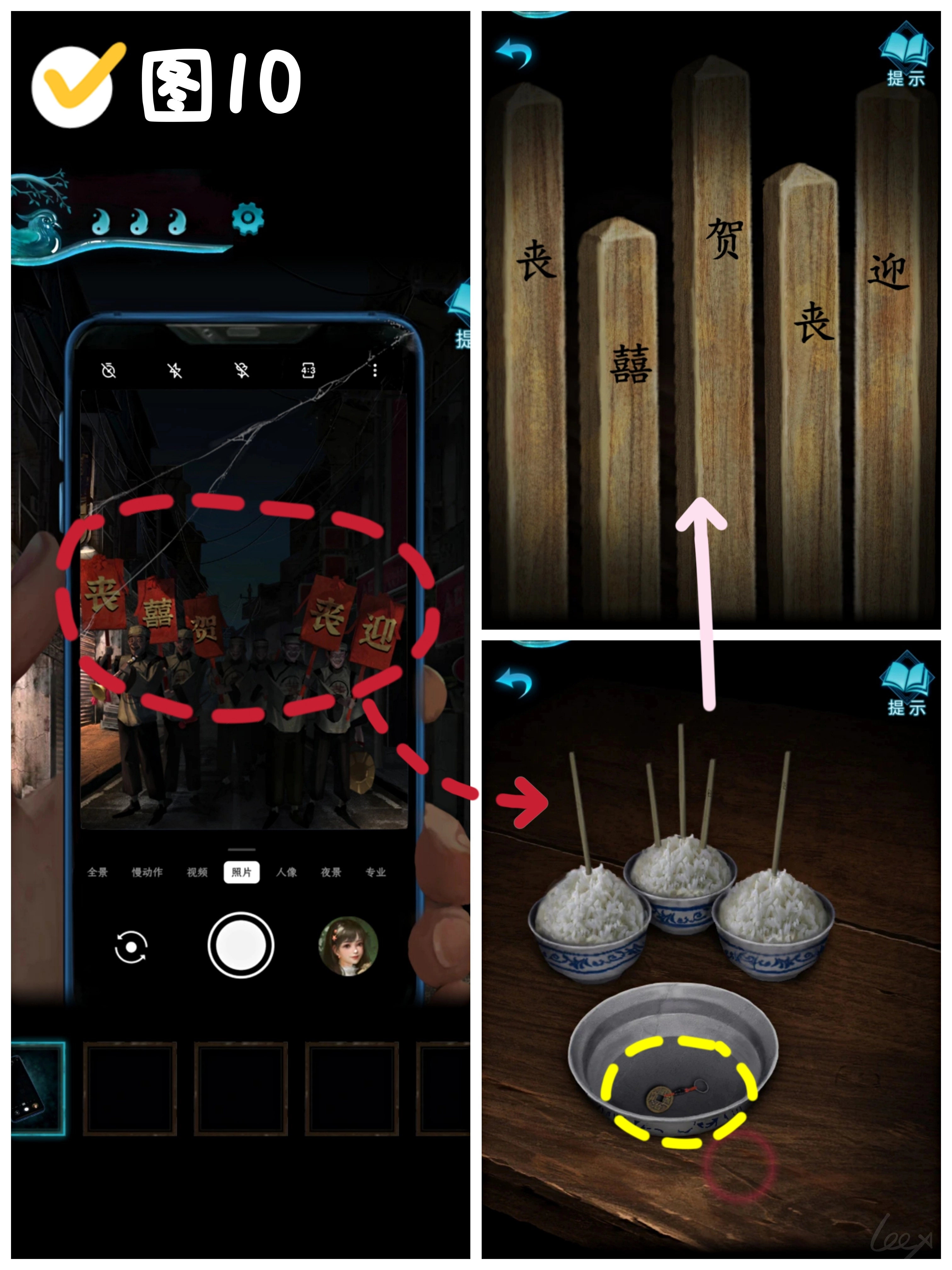 看纸人手中举的牌子,“丧-囍-贺-丧-迎”,右转来到月老处,点击右侧桌子,根据纸人举的牌子转动米饭上的筷子,黑汤见底,碗中拿到〔吊坠〕。(图10)