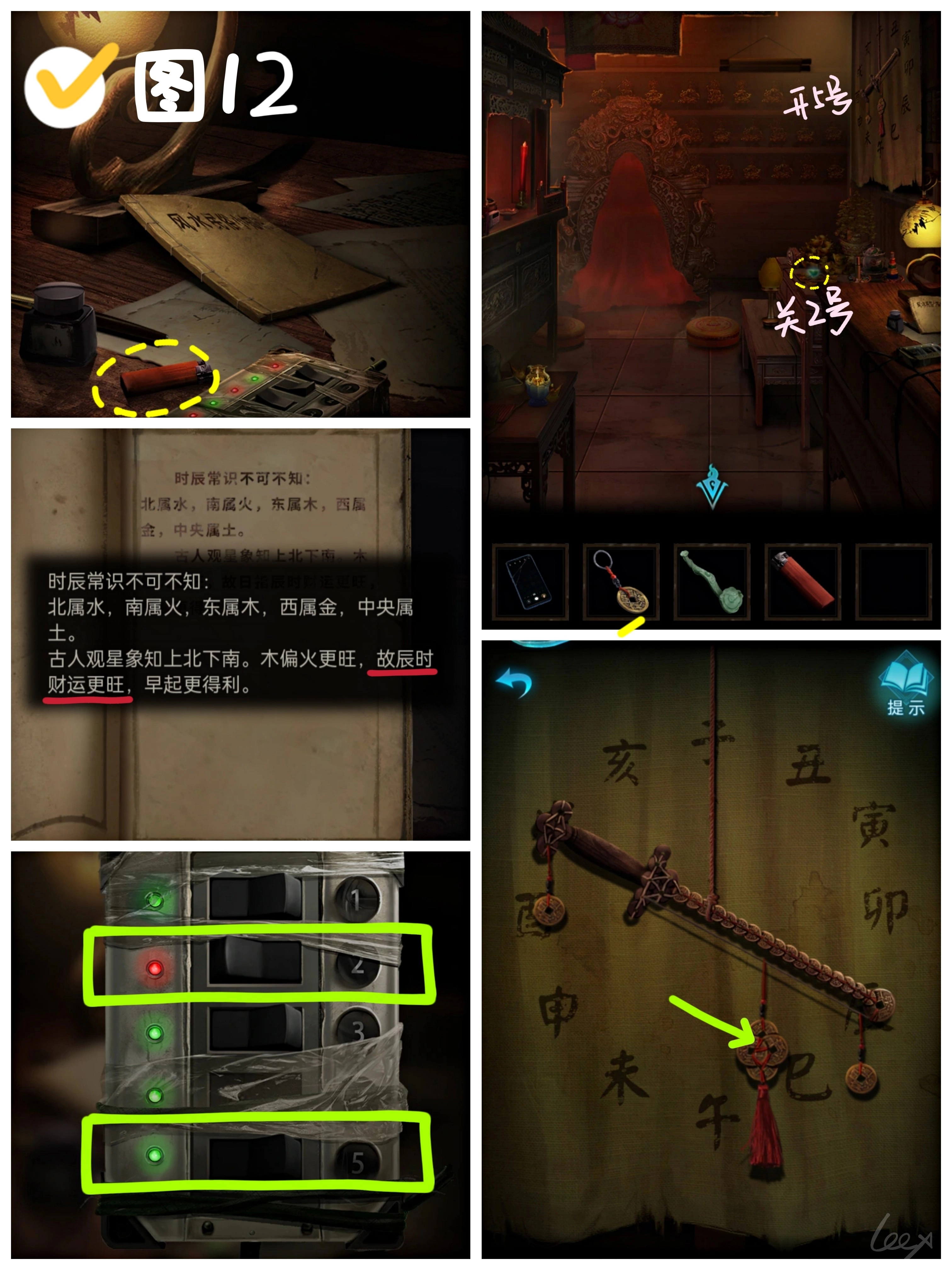 12. 往右转,走进六宝阁。在右侧的桌子上找到〔打火机〕,接着阅读《风水民俗小知识》。关闭2号开关后,从元宝模型上拿到发夜光的〔小元宝〕。再打开5号开关,点击查看右上角灯下的铜钱剑,把吊坠挂到剑的右端。依据《风水民俗小知识》第二页内容,“辰时财运更旺”,移动剑中间的大吊坠,让剑的右端指向“辰”,此时卷轴打开,即可获得〔小金鞭〕。(图12)