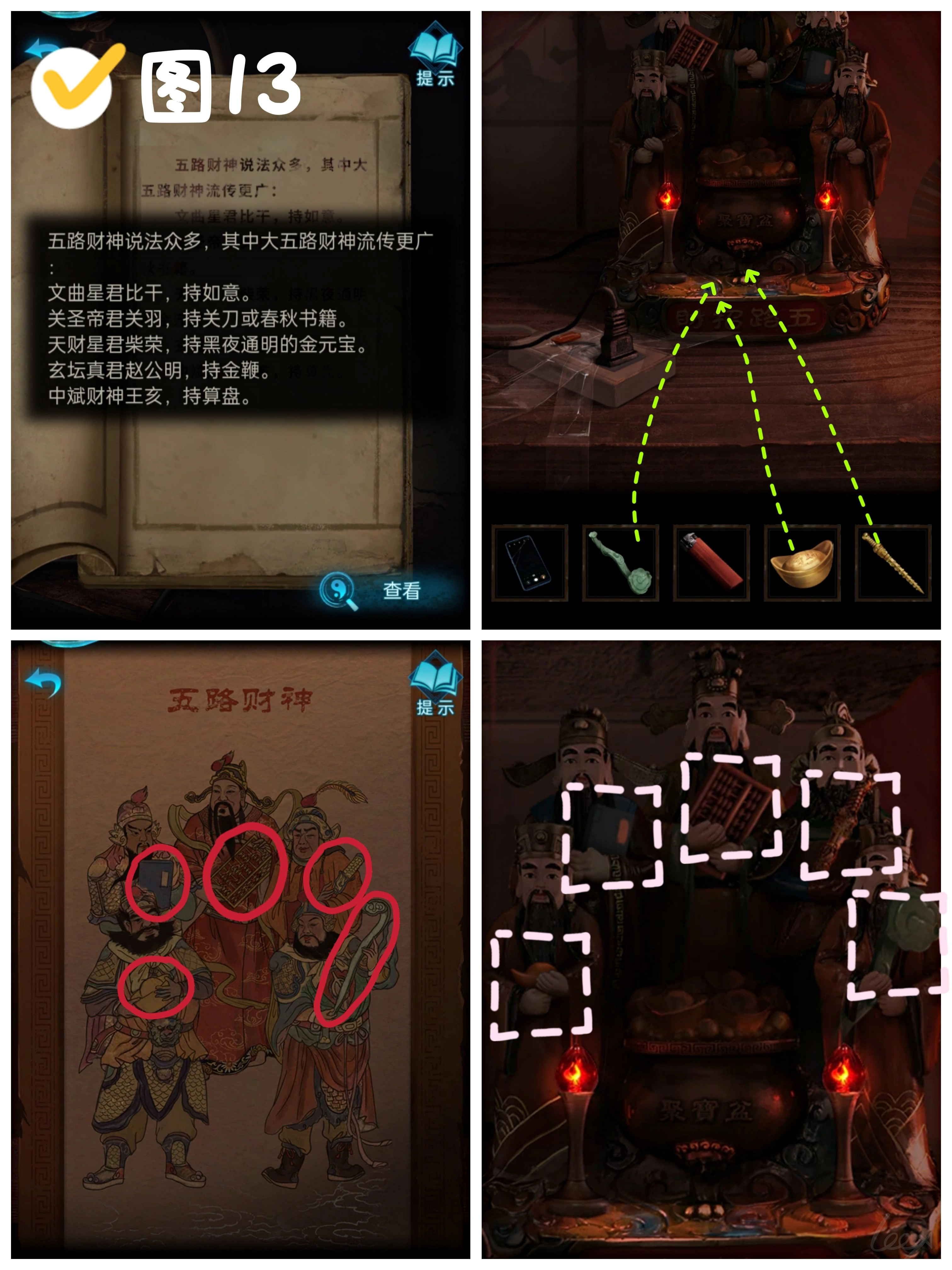 13. 依据《风水民俗小知识》第三页内容,五路财神各自持有一物(此为众所周知的信息)。需把背包里的小金鞭、小元宝、小如意放置到门外桌子上的五路财神像上。接着,按照六宝阁内展开的卷轴——五路财神画像,来调整每个财神手中所持物品,从左至右依次为“元宝 - 书籍 - 算盘 - 金鞭 - 如意”,完成这些操作后,易寿堂的门便会开启。(图13)