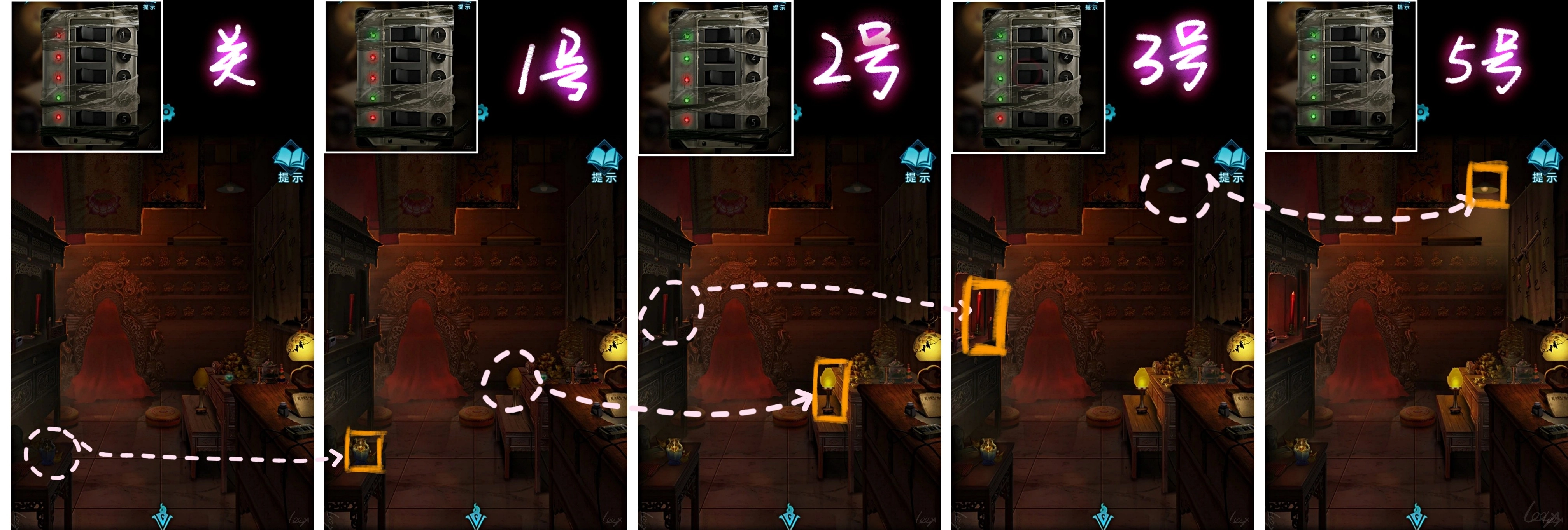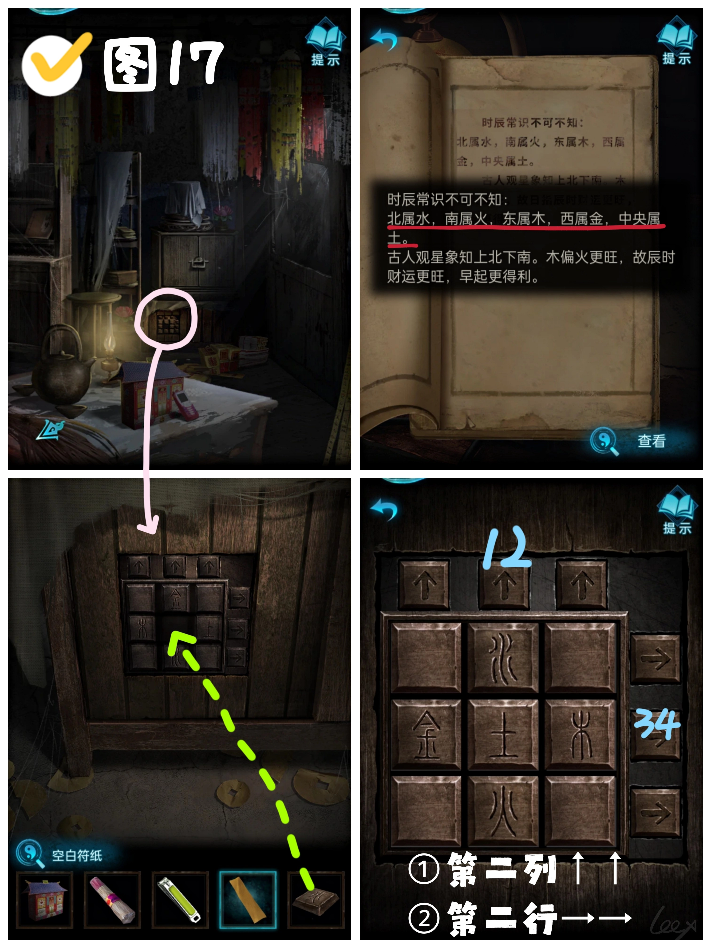 17.婚庆用品店内,点击右侧柜子左上角的鞭炮,点击开始后记住鞭炮亮的顺序,停止后按顺序点击,获得〔小零件〕。易寿堂内,将小零件安装到下方的柜子上,根据《风水民俗小知识》第二页的线索“北水-南火-东木-西金-中土”解锁柜子,拿到〔拨浪鼓〕。