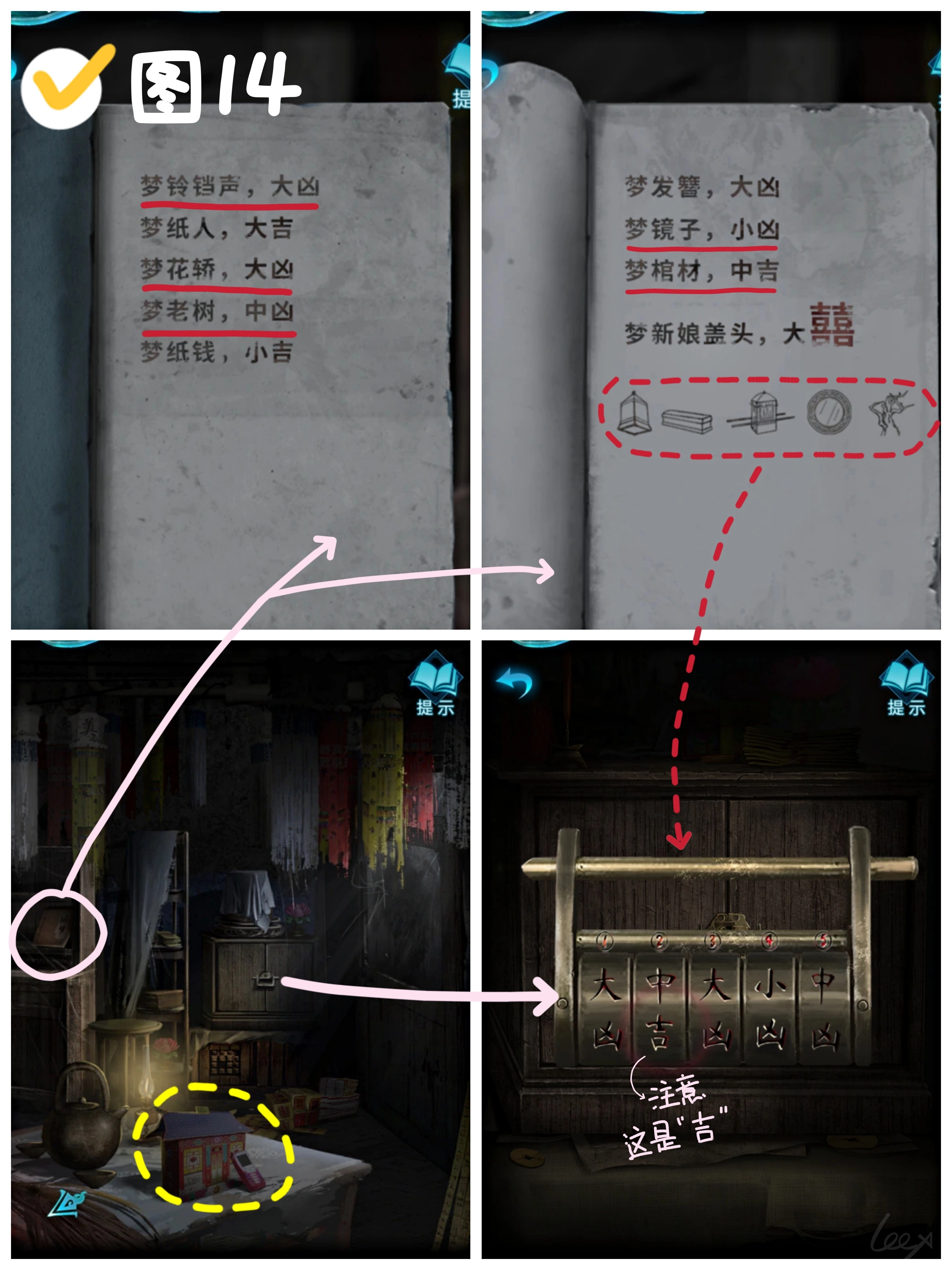 14.进入易寿堂,拿走桌子上的〔纸扎手机〕和〔纸扎寺庙〕。阅读左侧架子上的《解梦》,根据第二页的图标对应两页的吉凶线索,解锁右侧的柜子,“铃铛-棺材-花轿-镜子-老鼠”对应“大凶-中吉-大凶-小凶-中凶”,打开柜子获得〔小旗子〕。(图14)