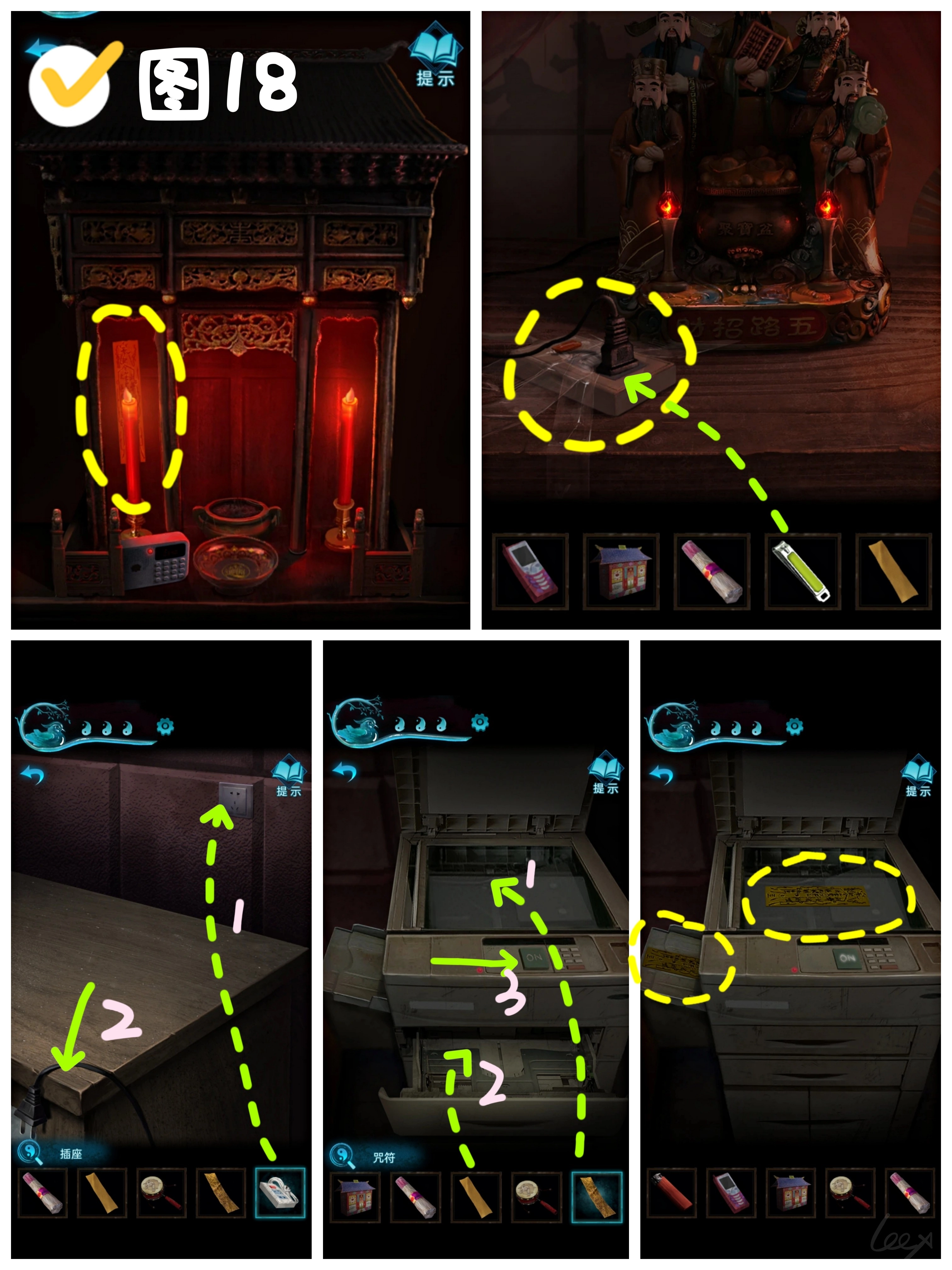 18. 在六宝阁里,先开启3号开关,接着点击左侧的神龛,把左侧的〔咒符〕取走。随后走到门外,用指甲刀刮开桌子上的透明胶带,取下〔插座〕。进入婚庆用品店后,点击收银台,将插座连接到电源,再点击复印机插头使其与插座相连。点击复印机,把咒符放在上方的扫描区域,把空白符纸放进下面的纸盒,点击开关ON,待复印完成后,点击拿走〔两张咒符〕。(图18)