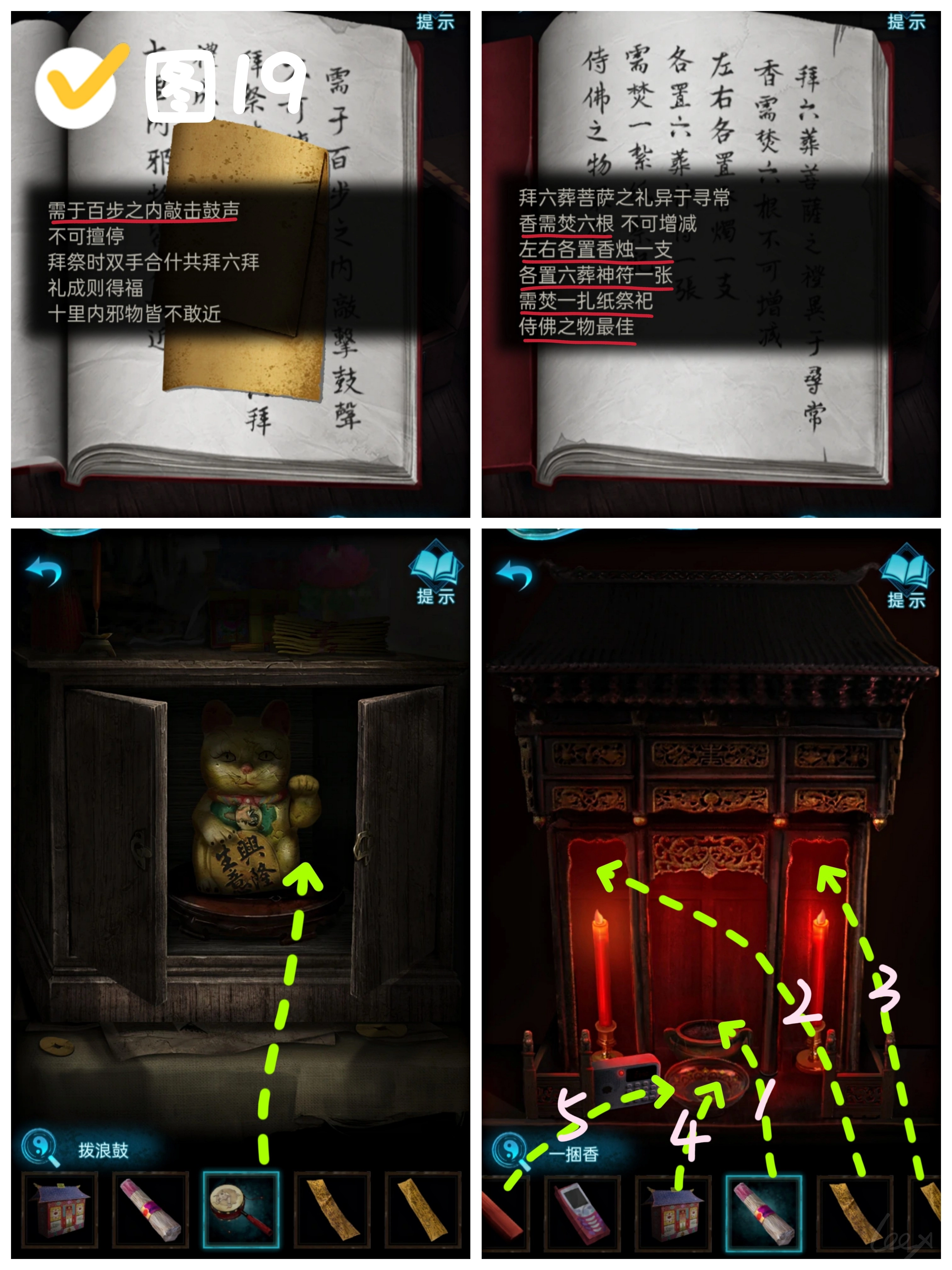 19. 依据婚庆用品店内的红皮书所述,周六葬菩萨时,需焚烧六根香,在左右两边各放置一支香烛,并准备咒符,焚烧一扎纸,同时在百步之内敲击鼓声。接着,进入易寿堂,把拨浪鼓放置在上方柜子里的招财猫上。之后,走进六宝阁,点击神龛,将香插入香炉,把两张符咒分别贴到两侧蜡烛的后方,把纸扎寺庙放进盘中,用打火机点燃(由于书中表明侍佛之物这样处理最佳,故而只需点燃寺庙)。(图19)
