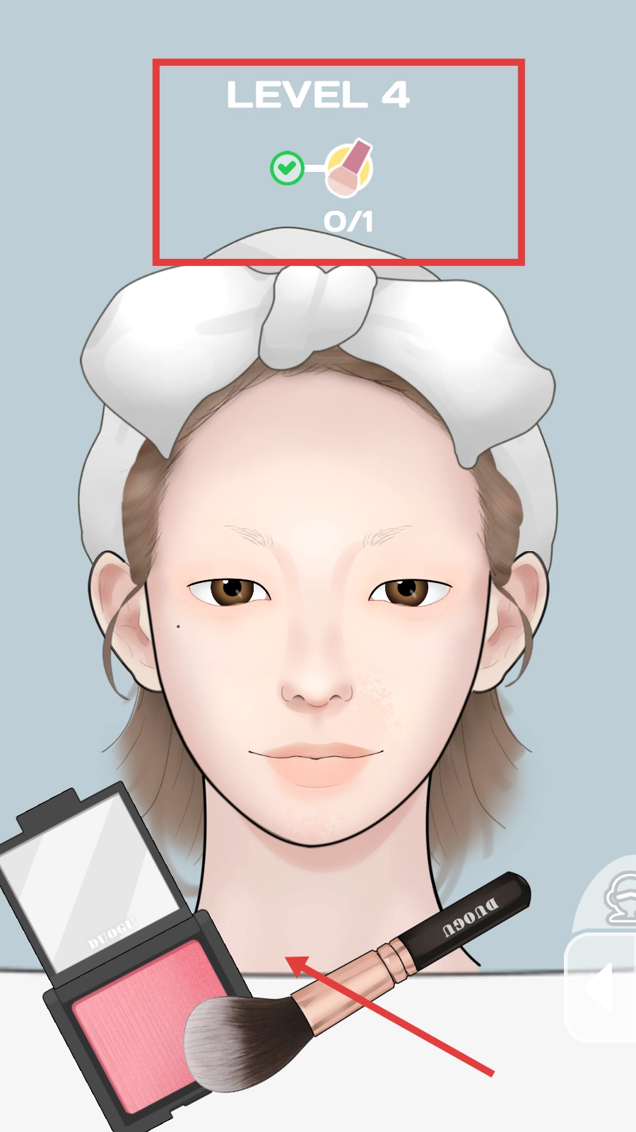 1、进入【LEVEL-4】,用粉扑蘸取腮红涂抹脸颊,完成【0/1】美妆步骤,推进化妆进程。