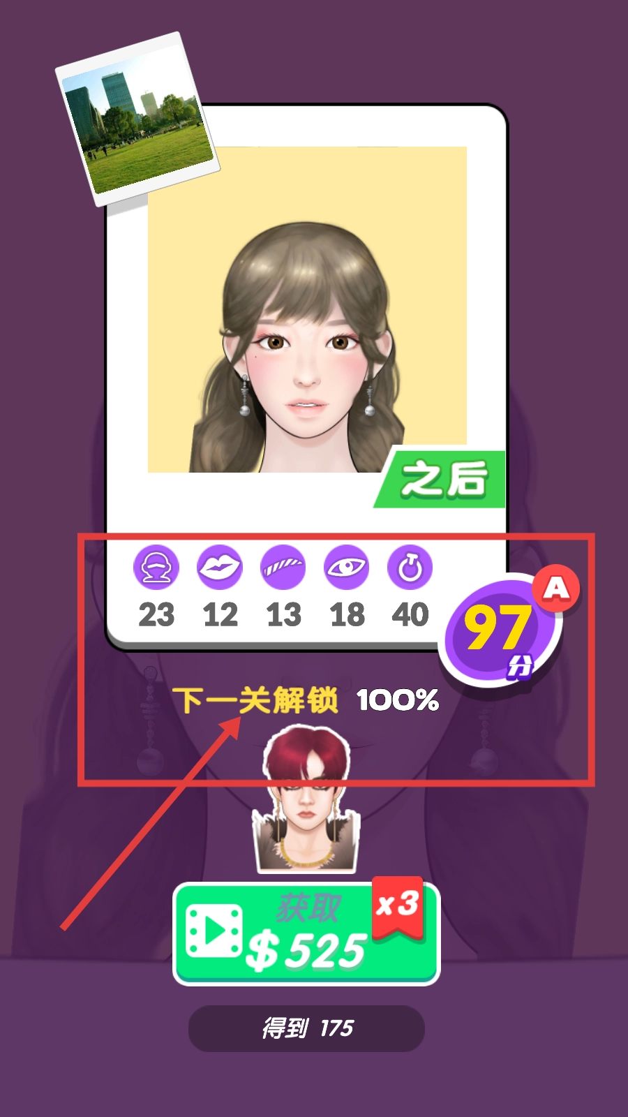 3、美妆关卡结束,查【97分】评级及数据,见【下一关解锁-100%】,领奖励启新挑战。
