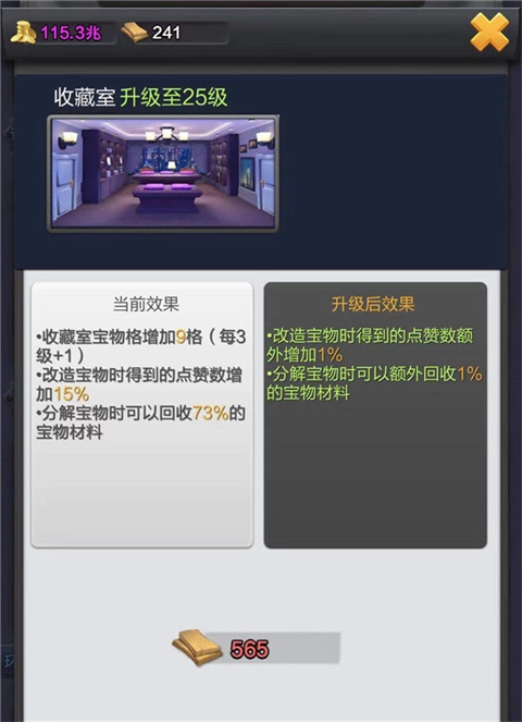 当玩家朋友升级建筑收藏室后,对应会增加游戏内的宝物格和分解宝物后获得的宝物升级材料。目前版本中,收藏室等级上限为30级。