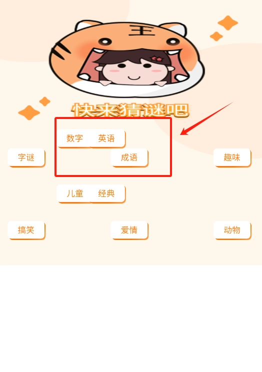 1. 当看到老虎头和“快来猜谜吧”字样时,点击橙色按钮来选择谜语类型。右侧的红色箭头提示您,可通过滑动查看更多分类。