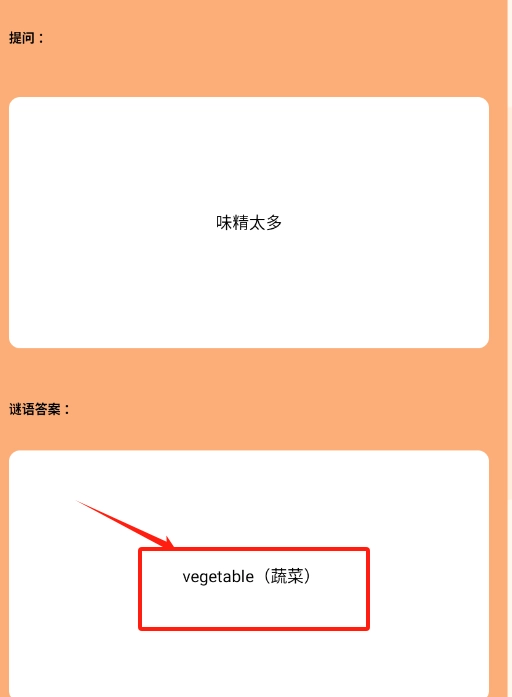 3、首先查看题目,若发现味精过多,接着点击下方白色的答案框,此时就能看到英文提示“vegetable(蔬菜)”,进而揭晓谜底。