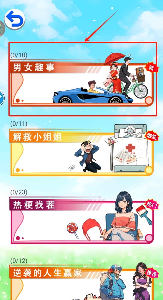 2、在蓝天白云背景界面,点击关卡选项如男女趣事、解救小姐姐等开始挑战。