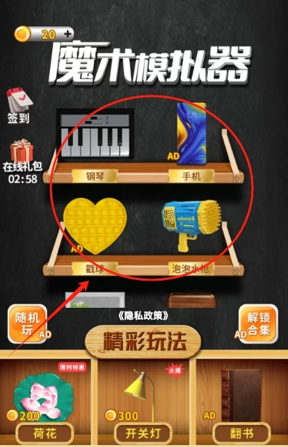 2、道具与技能系统,解锁 “魔术卡牌套装”“悬浮魔杖”“隐形披风” 等 20 + 种道具。