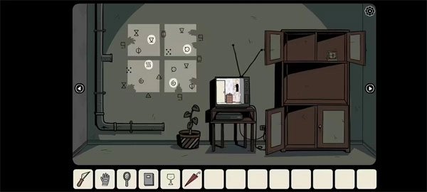 不知何时,房门旁矮柜上出现了那个旋钮。你顺手拿走旋钮,接着用酒瓶中的钥匙打开抽屉,从中拿到了绝缘手套。随后,你将旋钮安装到电视机上,刹那间灵感迸发,依照录像里呈现的,把两个旋钮旋转到画面中圆圈与横线对应的位置,进而得到了一个把手。