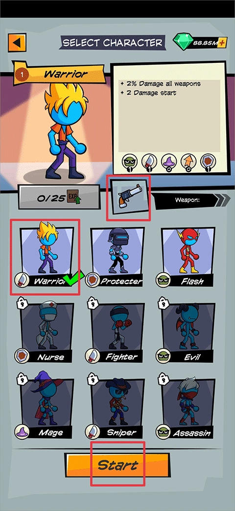 2、接着在英雄界面里挑选一个心仪的英雄,要知道每个英雄所使用的武器各不相同呢。挑选完毕后,点击“start”开启游戏。