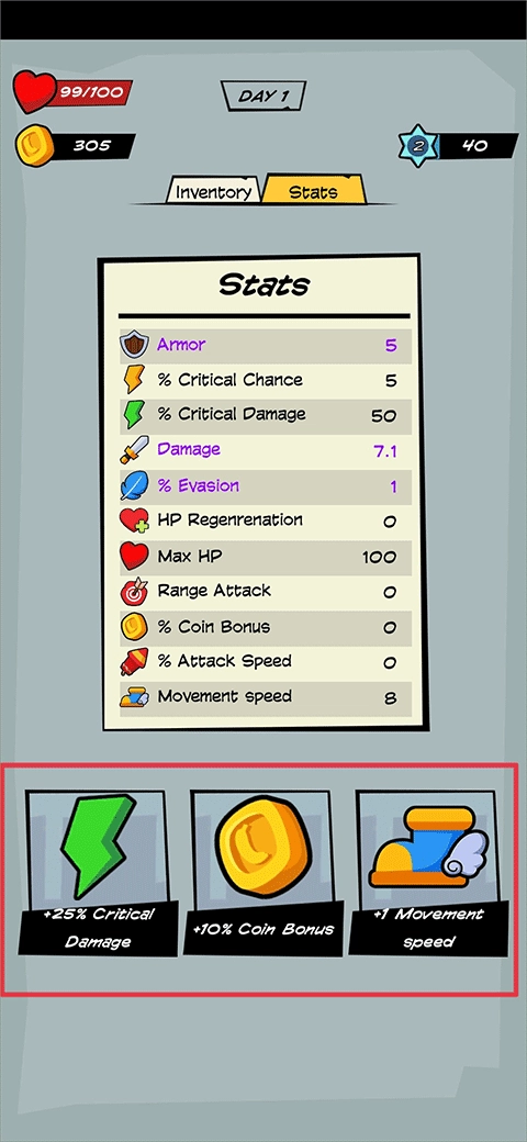 5、当倒计时结束时,战斗也随之结束。随后,你能够在统计数据界面的下方挑选一个升级技能,例如若选择鞋子,就能为角色提高一定的移动速度。