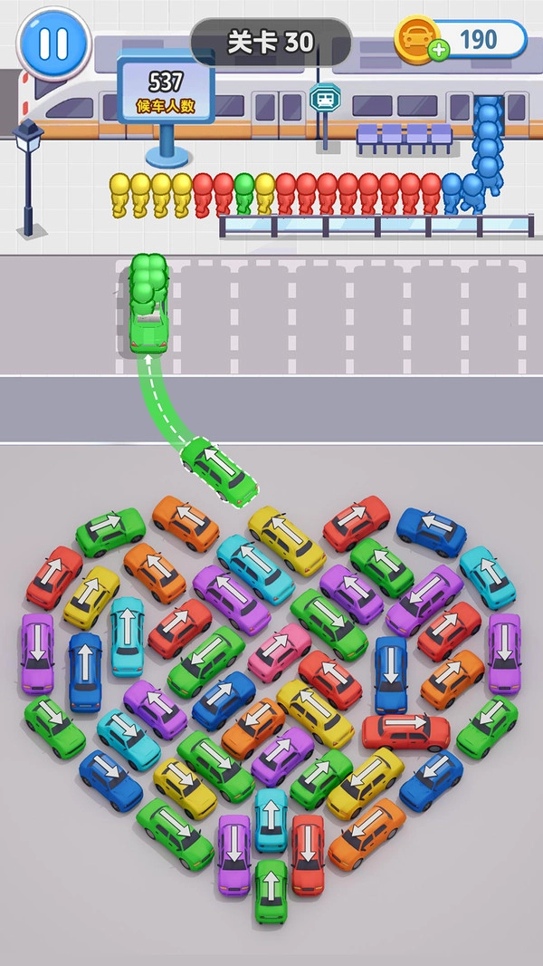 停车场里密密麻麻地挤满了各种各样颜色的小人和车辆。你的任务是:迅速点击与小人颜色一致的车,帮助小人上车。要让同一颜色的小人填满一辆车,一旦车被填满,车就会“嗖”的一下疾驰而去,从而腾出空间!不断重复这样的匹配小人上车以及车辆开走的操作,直到把所有小人都清理完毕,让原本混乱不堪的停车场变得井然有序!这便是最直观、最能带来畅快体验的消除成就!