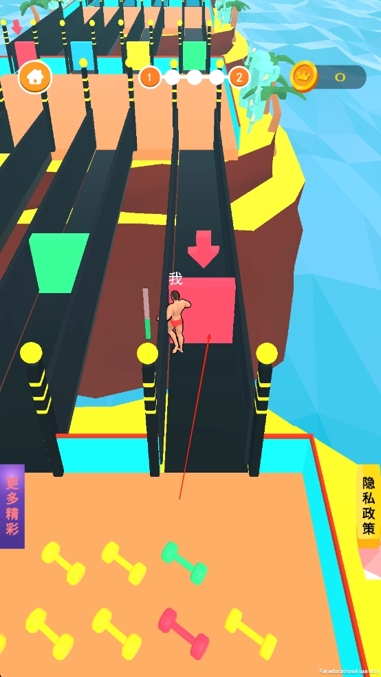 1. 进入游戏后,在「新手教程」中,通过滑动屏幕来操控肌肉男左右移动,点击屏幕可让肌肉男跳跃以躲避路障。首次通过关卡时,需要收集50个金币,方可解锁「基础肌肉男」,该角色的默认奔跑速度是8m/s 。