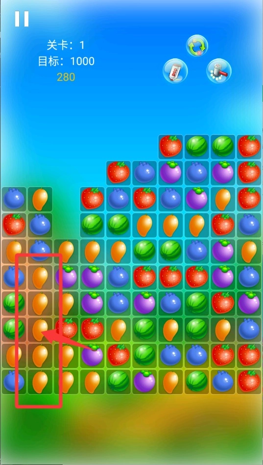 2、专注于屏幕,寻找相同的水果,只要有三个及以上相连,即可点击消除。消除得越多,分数增长速度越快,达成目标便能顺利通关。