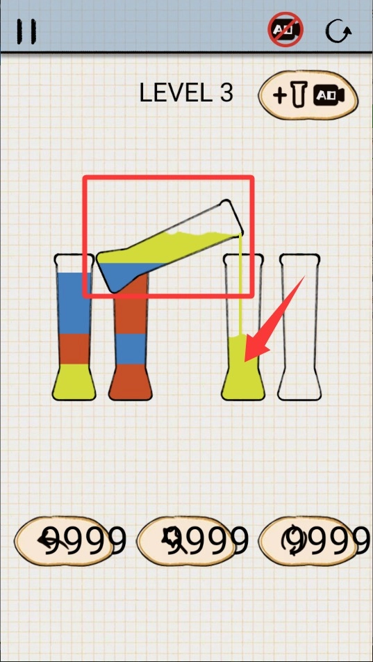 3、借助不断重复的倒换动作,对杂乱无章的颜色进行分类归整,只有当每个试管都装满单一颜色的液体时,才算达到合格标准。