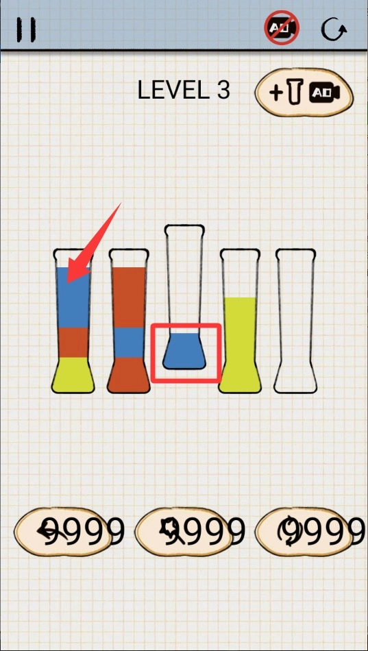 2、点击选中某一试管,随后点选目标试管,即可将液体倒入其中。需注意,每次仅能转移同种颜色液体的最上层部分。
