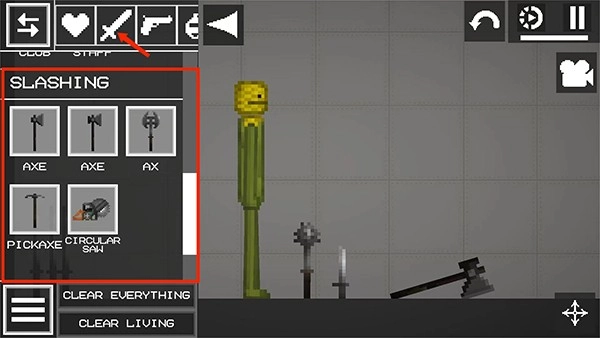 6、点击【宝剑】图标,此时宝剑、锤子、斧头等冷兵器可供选择使用。