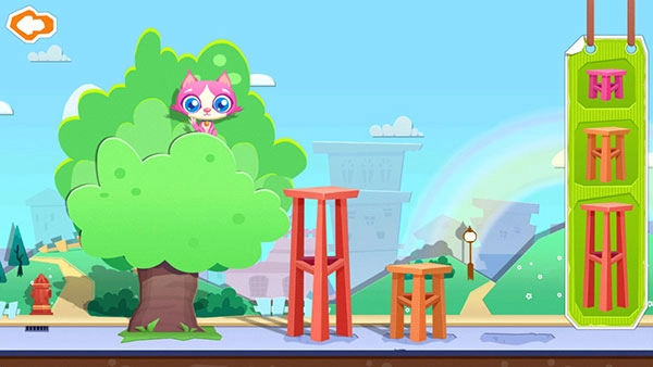 6、然而,小猫被吓到了,不敢从树上下来。别慌,把右边的凳子按照从高到低的顺序拖到指定地点,给它搭建一个梯子!太好了,猫咪平安地跳了下来。