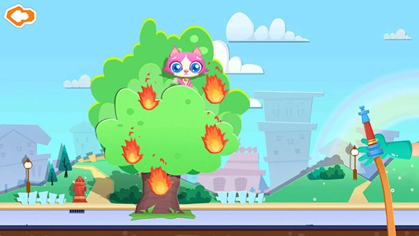 5糟了,竟然着火了,而且还有只小猫被困在树上。小伙伴们,赶紧帮消防员糖糖一把,拖动右边的水管,对准火团喷水。哇!大火终于熄灭啦!