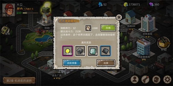 2、第二章第7关刷弹夹(求助警察局):从此时开始,玩家就可以重复刷2-7来获得大量弹夹了,手动刷关或扫荡刷关都可以,这一关玩家只要把第一层僵尸杀光就可以,第二层可以直接开门找炮哥帮打,弹夹是玩家闯关的资本,虽然关卡中玩家的弹夹只显示3个,但是实际可以把背包里所有弹夹用掉,只要舍得刷弹夹用弹夹,刷到3-3并不难。