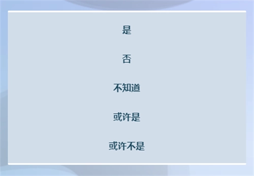 2、针对所有提问,仅需从固定的五个回答里挑选,这五个回答分别是:是、否、不知道、或许是、或许不是。