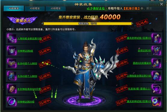 大概在40级左右会开启“神装收集”功能,完成该功能相关的任务后,就能获得一套紫色装备。