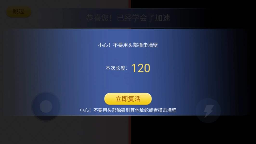 接下来会进入一段游戏教程,能帮助玩家更熟悉游戏玩法;左侧按钮用来控制蛇的移动方向,右侧按钮则负责让蛇加速。