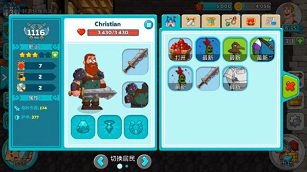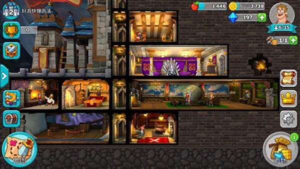 我们还能点击城堡里的角色,把背包中的装备给他们穿上,不过要留意,部分特殊装备只能给特定角色佩戴。比如铠甲仅能给坦克穿、法杖只能给法师用之类的,并且这些装备都能有效提升对应特殊角色的属性。当资金充足时,可以点击右下角的市场,添加新的房间。我们可以建造的房间有生产类、训练类、支援类、宝藏类、混杂类等不同类型。