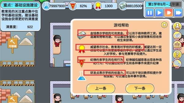 是一款深度还原高中校园运营的模拟经营游戏,玩家将以校长身份全权主导学校的崛起之路。从资源整合调配到上级任务攻坚,从教学体系搭建到校园秩序维护,每一项决策都直接关乎学校的发展走向,最终目标是将这所普通高中打造成全国顶尖的教育标杆。相较于前作,游戏大幅拓展了管理维度,新增诸多贴近真实校园的细节玩法。可以通过【游戏帮助】功能来熟悉各项核心资源的作用:其中【金钱】是维持学校日常运营的关键;【威望】能够助力提升学校等级;【纪律】则用于约束学生的行为规范。