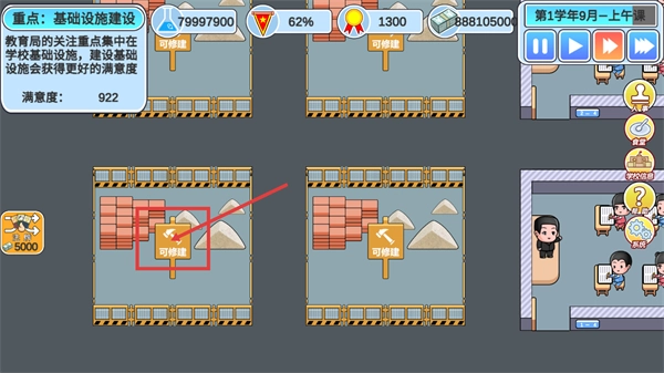 在【重点:基础设施建设】阶段,点击场景里带有【可修建】标识的区域,就能进入校园建设界面,通过推进设施搭建来提升满意度。