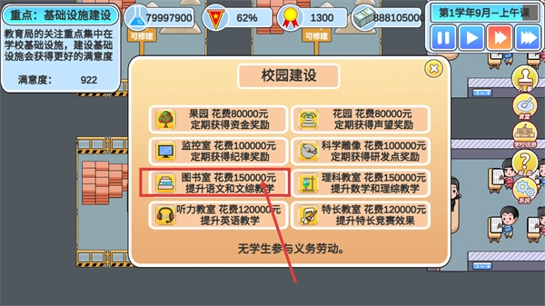 在校园建设过程中,若选择打造【图书室】,投入【150000元】即可增强语文与文综的教学成效,为学生在这些科目的成绩进步提供有力支持。