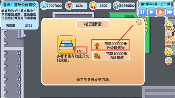 已经建成的建筑(比如图书室)能够花费【200000元】来完成升级,以此进一步增强它的功能效果,提高校园设施的价值。