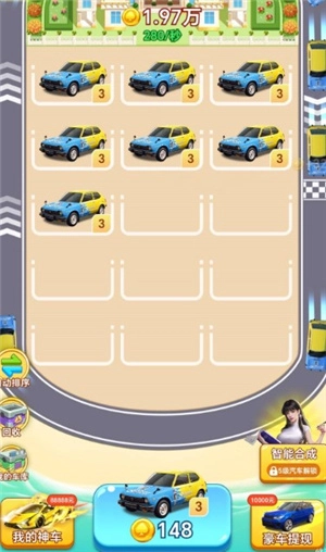 这款休闲小游戏钱途满满,只要合成汽车就能一直领红包。操作上毫无难度,玩家只需不断购买车辆,拖动相同等级的车辆即可合成;合成出5级汽车后,自动合成功能便会开启,后续无需玩家操作,车辆就能快速完成合成,大大节省了时间。