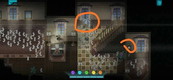 第一关的内容我再详细说明一下:一楼右侧有个钟,二楼能找到腌橄榄、书包、书和花。需要特别注意的是,要把这些物品和一楼右上方的伞关联起来。