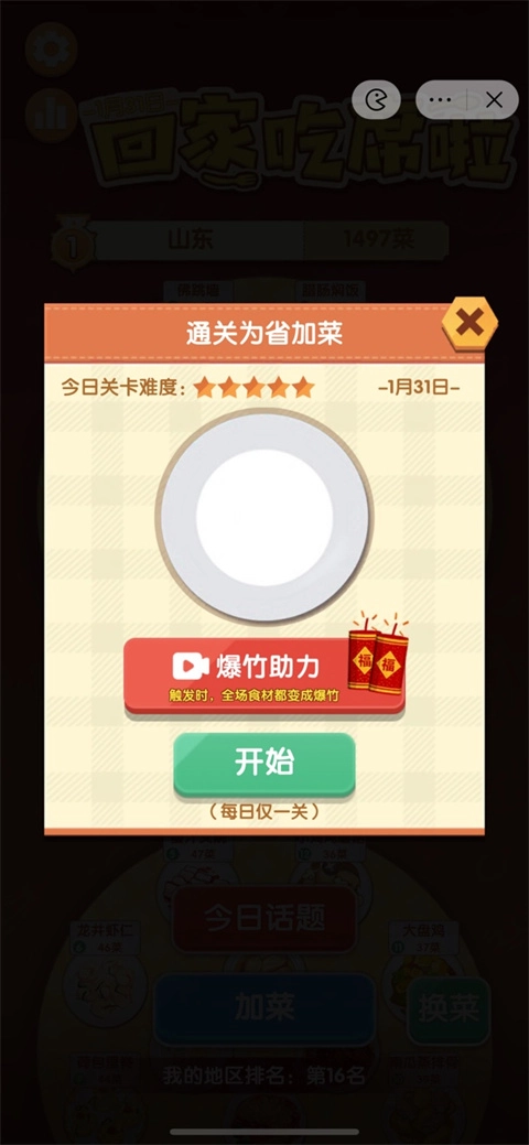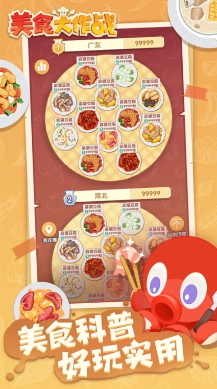 游戏场景中包含多种不同类型的原材料,蔬菜、酒类等物品一应俱全,玩家需要快速对这些物品进行匹配消除。只要在规定时间内完成挑战,就能为自己所在的省份“加菜”。首先进入美食大作战手机版,点击加菜;