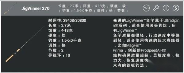 一般在路亚后期作钓中常用的直柄路亚竿包括:JigWinner 270(我们通常也叫它小270)。这款小270的优势在于其2米7的长度,搭配小克重假饵时,抛投距离可达30到60米,很适合针对小体型鱼类展开精细化作钓,一般用来钓4公斤以内的鱼,若超过4公斤,作钓起来就比较费劲了。