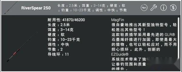 RiverSpear 250这款竿子是随蒙古地图一同推出的新品,它的诞生填补了此前缺少小饵搏大鱼专用竿的空白,适配10克以内的假饵,在抛投距离和钓重方面表现出色。