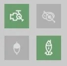 这张图的左上部分是纺车轮的使用标志,右上部分是水滴轮的使用标志,左下部分是浮子的使用标志,右下部分是路亚假饵的使用标志。通常情况下,大家选择渔轮时,只要根据鱼竿的拉力大小来搭配合适的轮子就可以了;只有在进阶之后,才需要依据目标对象鱼的习性,去挑选不同收线速度的渔轮。